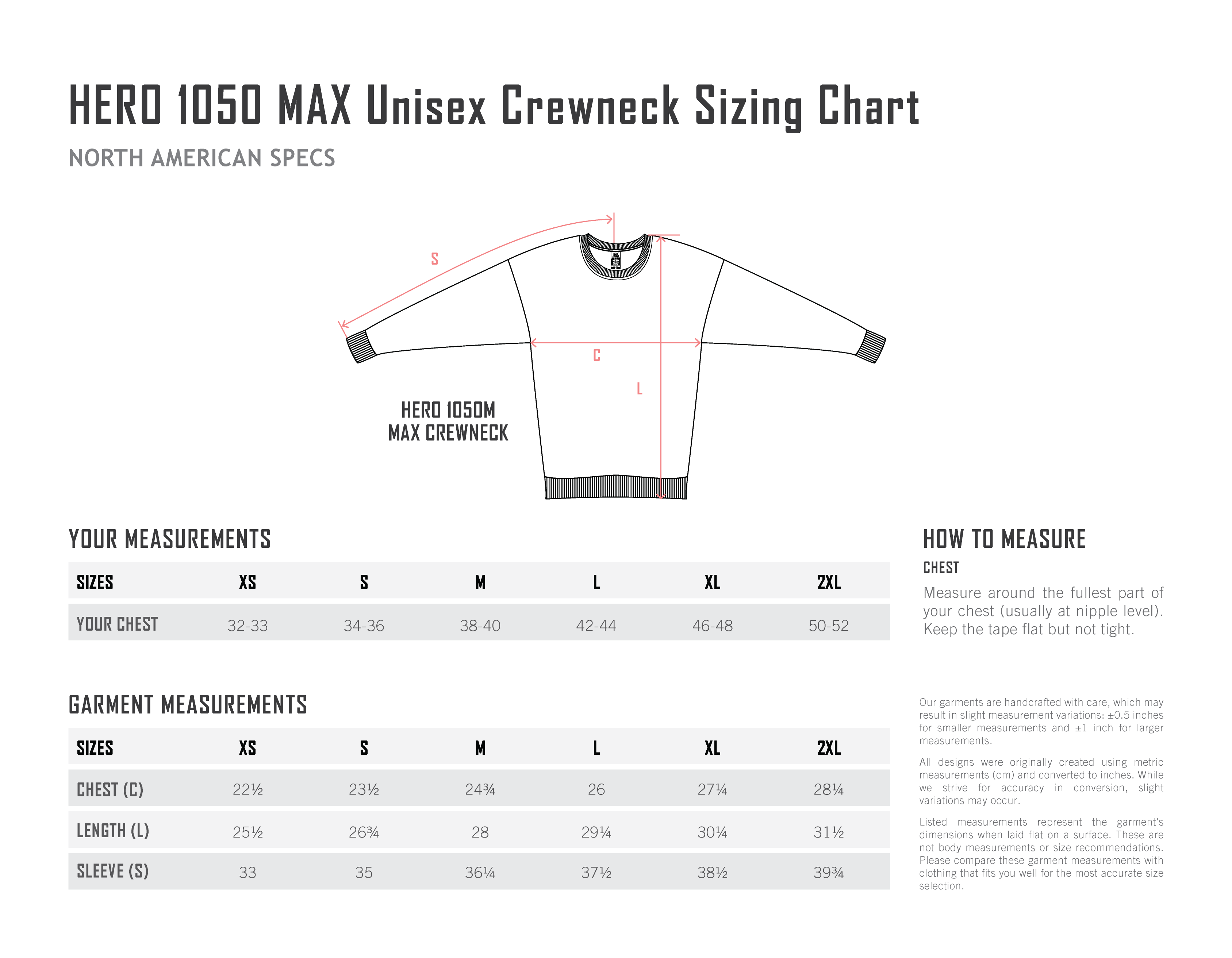 | Chest (C) | 22.5 in | 23.5 in | 24.75 in | 26 in | 27.25 in | 28.25 in |
