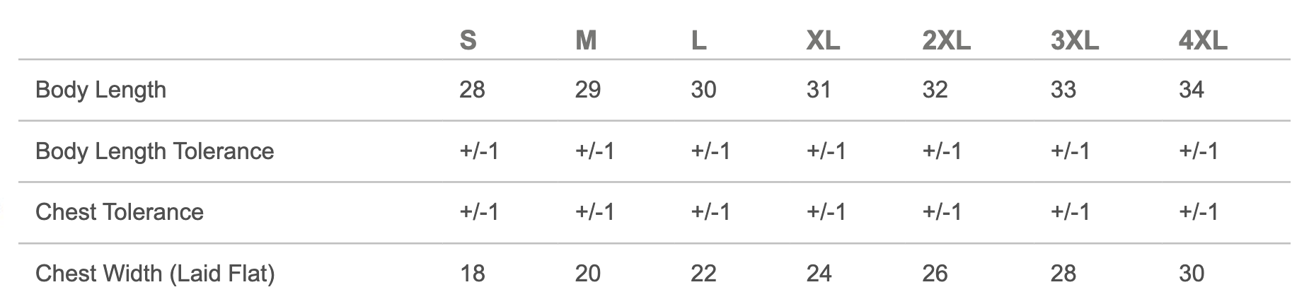 | Chest Width (Laid Flat) | 18 | 20 | 22 | 24 | 26 | 28 | 30 |